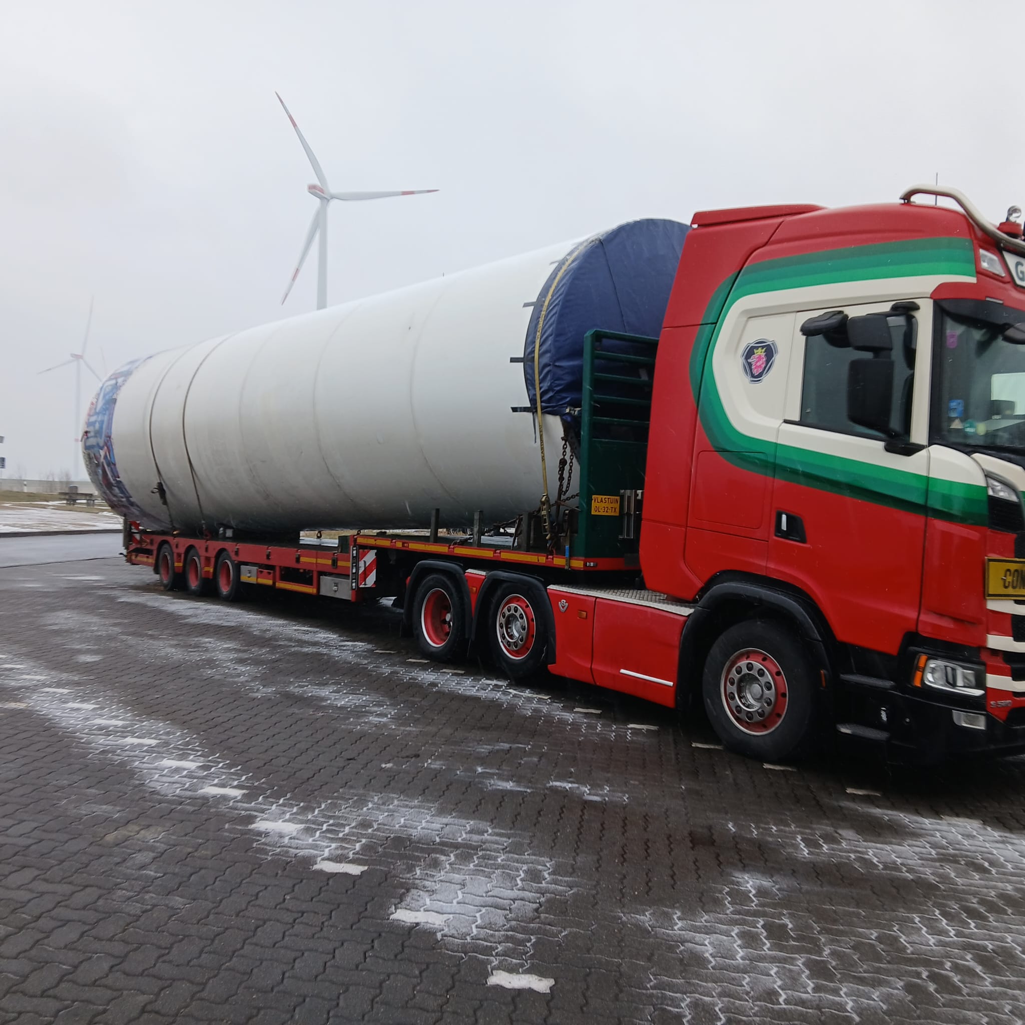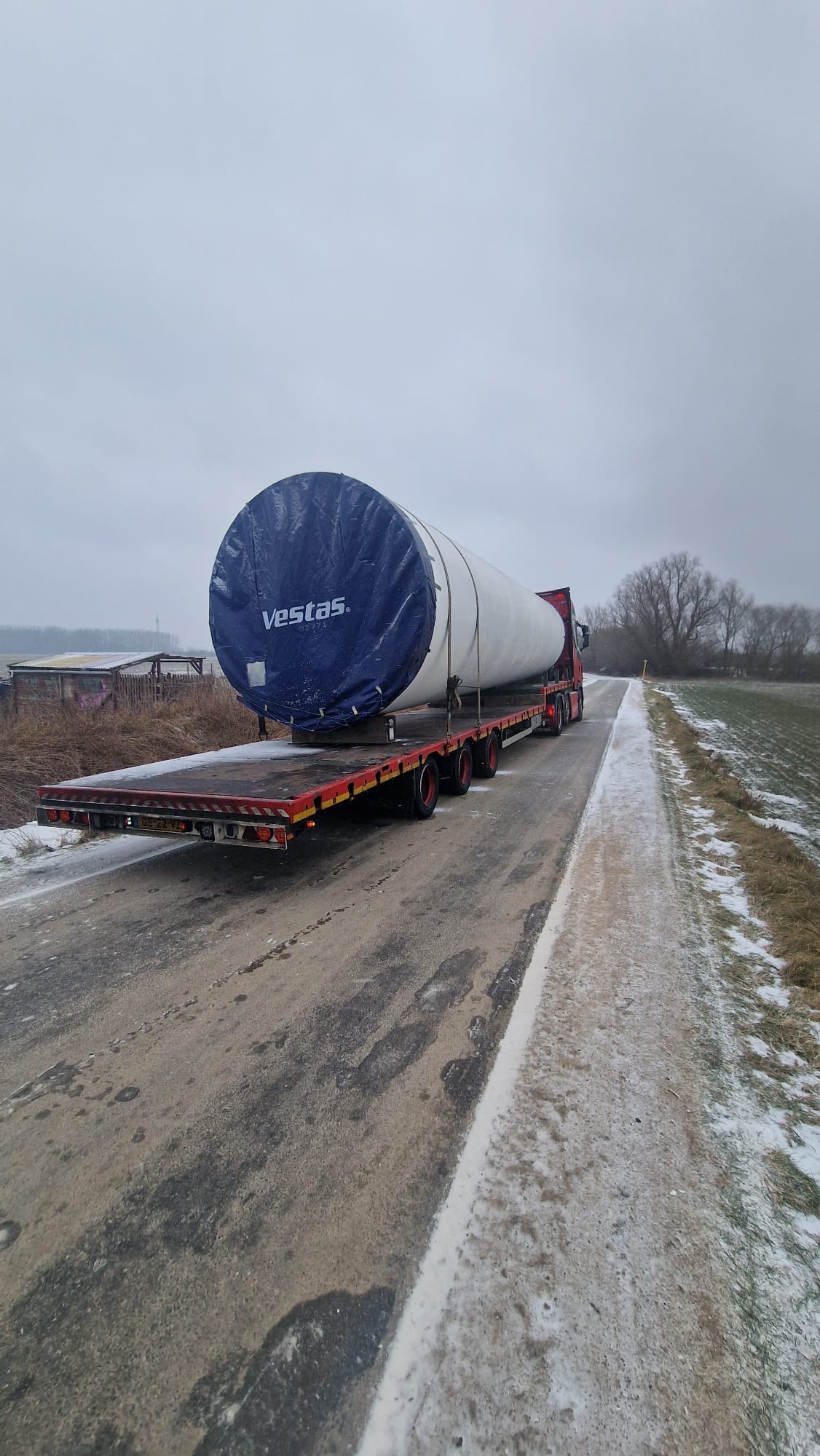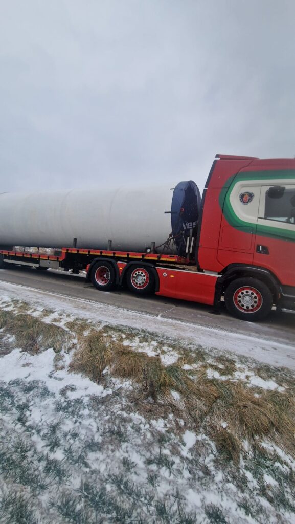 Loading and transport of a V39 40m tower North Germany to Northern Ireland February 26 Well done guys temperatures —3 degrees cold 🥶 Great job